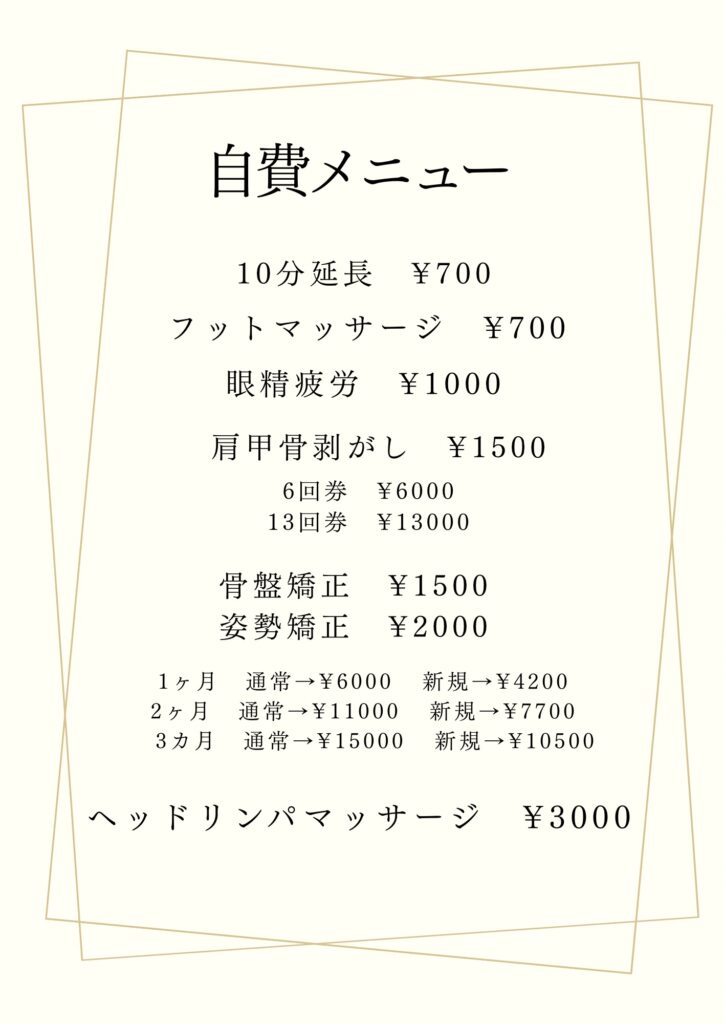 保険診療の他にも、自費での施術メニュー充実しております!!